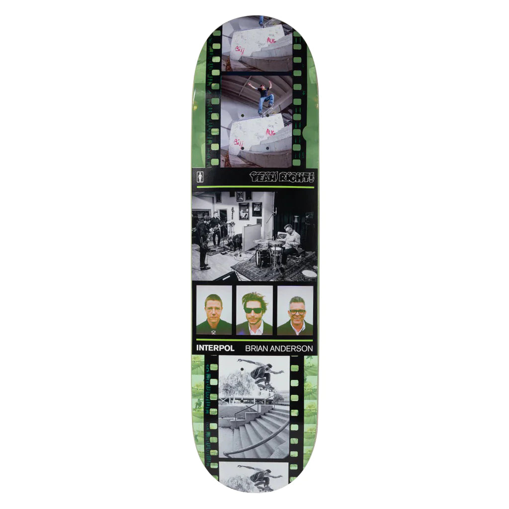 “Atiba asked me if I’d be interested in doing a board with his photos of Interpol & myself mixed together. As I had picked one of their songs “Obstacle 1” Twenty years ago for my part in Girl Skateboards video “yeah right!” So I excitedly said yes of course. 20 years? Wow! I remember bringing the CD “Turn on The Bright Lights” to Ty Evans apartment on Sunset? I said to him. “I got this song of this great band and not a lot of people know how good they are yet. I really want to use this song.” And Ty loved it. He started editing to it right away. I had so much footage and it’s one of the best video parts I’ve had. What an incredible feeling. Also I remember being so happy that Ty didn’t show me much of the video. I liked that. I wanted to be almost as surprised as someone who had no involvement. I had helped with a lot of skits so I had a feel for the video but at the premiere I was very surprised by everyone’s skate footage. I had only witnessed a handful of my teammates tricks in person. Everyone’s skating was amazing. Great editing & filming. Great skits. Incredible music and skateboarding. I am very proud to have skated so hard and worked so hard on all the little things with our Girl/Chocolate family. Seasons like that in life are priceless.” —Brian Anderson